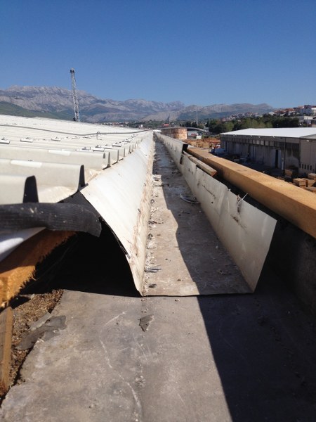 · Zbog velike površine krova ( cca 4800 m2 ) i svjetlosnih traka na krovu objekta ( cca 500m2 ) ,mjestimične dotrajalosti krovnih panela ( progib panela , hrđa sa rupama , loši poprečni spojevi panela ) bila je potrebna sanacija postojećeg krovišta.