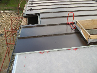 · Postojeća AB deka iznad garaže je propuštala vodu u prostor garaže. Na AB deki je napravljena drvena nosiva konstrukcija. Po njoj je postavljen brodski pod po cijeloj površini. Paropropusna folija, kontraletva visine 8cm, između kontraletve izolacija stiropor 5cm, letva i završni pokrov krovne trapezne ploče sa pripadajućom limarijom i opšavima.