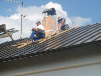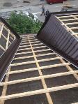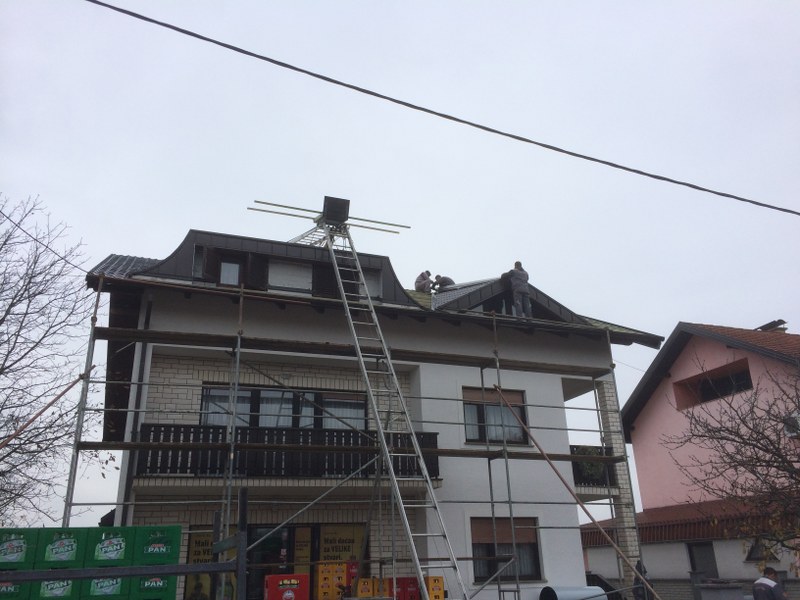 · Nakon skidanja salonitnih ploča, cijeli krov je očišćen do golih greda , rogova. Postavljen je po rubovima krova brodski pod, a ostali dio daščana oplata, pa paropropusna folija, kontra letva, letva i kao završni pokrov limene crijep ploče sa pripadajućom limarijom i opšavima.