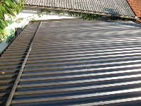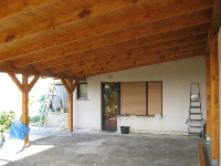 · Postojeća AB deka iznad garaže je propuštala vodu u prostor garaže. Na AB deki je napravljena drvena nosiva konstrukcija. Po njoj je postavljen brodski pod po cijeloj površini. Paropropusna folija, kontraletva visine 8cm, između kontraletve izolacija stiropor 5cm, letva i završni pokrov krovne trapezne ploče sa pripadajućom limarijom i opšavima.